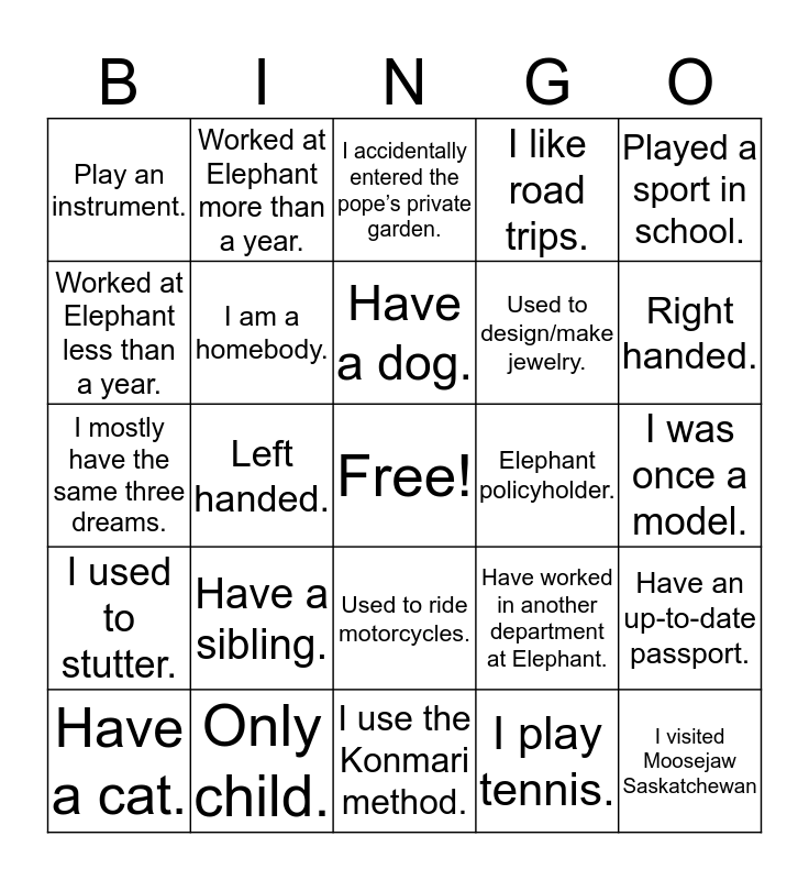 This bingo card has a free space and 24 words: Have a sibling., Only child., Have a dog., Have a cat., Played a sport in school., Play an instrument., Worked at Elephant less than a year., Worked at Elephant more than a year., Elephant policyholder., Used to ride motorcycles., Used to design/make jewelry., I mostly have the same three dreams., Have worked in another department at Elephant., Have an up-to-date passport., I am a homebody., I play tennis., I was once a model., I accidentally entered the pope’s private garden., Right handed., Left handed., I visited Moosejaw Saskatchewan, I used to stutter., I like road trips. and I use the Konmari method..