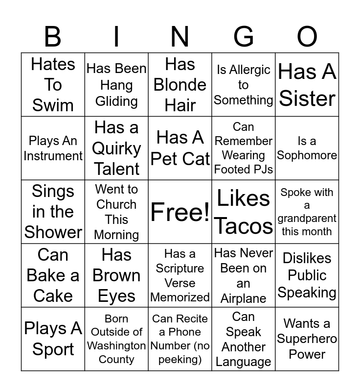 This bingo card has a free space and 24 words: Has Brown Eyes, Born Outside of Washington County, Has A Pet Cat, Plays A Sport, Has A Sister, Hates To Swim, Plays An Instrument, Has Been Hang Gliding, Likes Tacos, Has a Scripture Verse Memorized, Can Remember Wearing Footed PJs, Sings in the Shower, Has Never Been on an Airplane, Dislikes Public Speaking, Has a Quirky Talent, Can Speak Another Language, Spoke with a grandparent this month, Has Blonde Hair, Is a Sophomore, Went to Church This Morning, Wants a Superhero Power, Can Bake a Cake, Is Allergic to Something and Can Recite a Phone Number (no peeking).