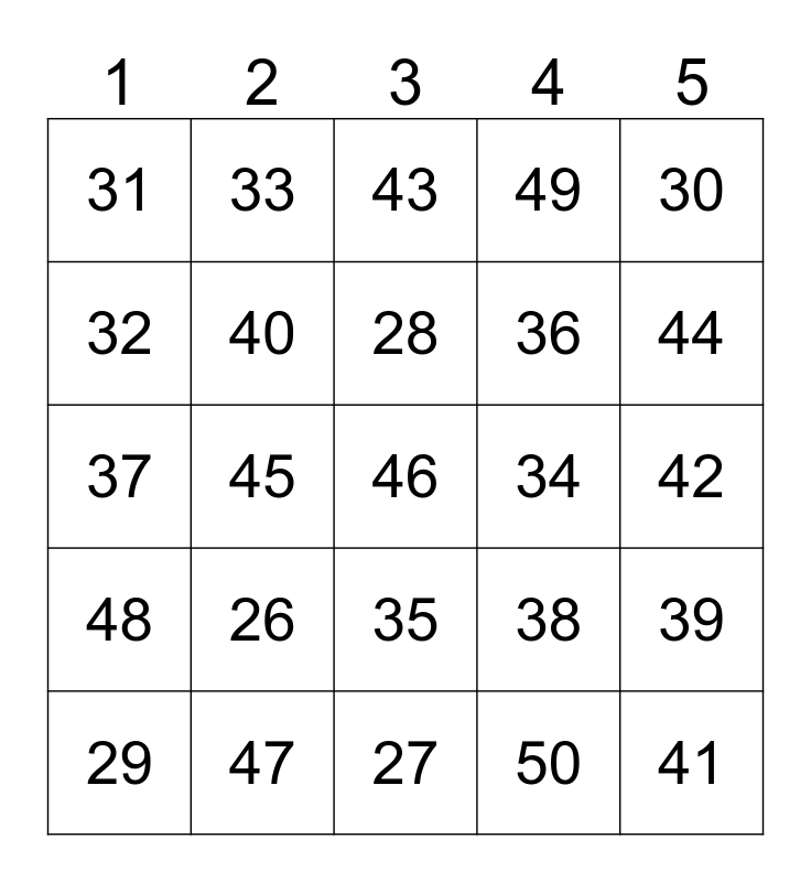 This bingo card has 25 words: 26, 27, 28, 29, 30, 31, 32, 33, 34, 35, 36, 37, 38, 39, 40, 41, 42, 43, 44, 45, 46, 47, 48, 49 and 50.