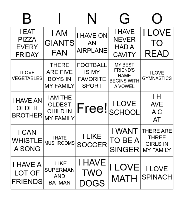 This bingo card has a free space and 25 words: I HATE MUSHROOMS, I HAVE TWO DOGS, FOOTBALL IS MY FAVORITE SPORT, I HAVE A LOT OF FRIENDS, I LOVE TO READ, I EAT PIZZA EVERY FRIDAY, I LOVE VEGETABLES, I AM GIANTS FAN, I LOVE SCHOOL, I LIKE SOCCER, MY BEST FRIEND'S NAME BEGINS WITH A VOWEL, I HAVE AN OLDER BROTHER, I WANT TO BE A SINGER, THERE ARE THREE GIRLS IN MY FAMILY, THERE ARE FIVE BOYS IN MY FAMILY, I HAVE BLUE PAJAMAS, I HAVE A CAT, I HAVE ON AN AIRPLANE, I LOVE GYMNASTICS, I AM THE OLDEST CHILD IN MY FAMILY, I LOVE SPINACH, I LIKE SUPERMAN AND BATMAN, I CAN WHISTLE A SONG, I HAVE NEVER HAD A CAVITY and I LOVE MATH.