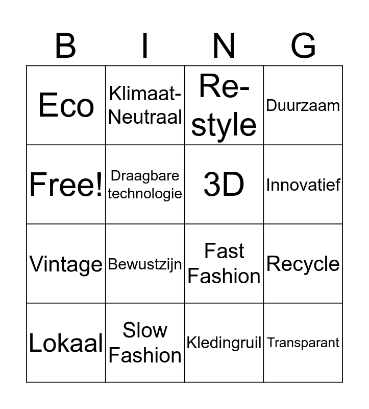 This bingo card has 16 words: Slow Fashion, Recycle, Re-style, Eco, Vintage, Klimaat-Neutraal, Fast Fashion, Kledingruil, Free!, Draagbare technologie, Lokaal, Duurzaam, Bewustzijn, Innovatief, 3D and Transparant.