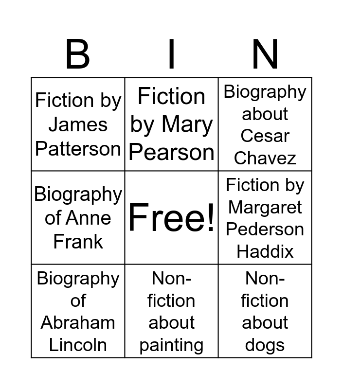 This bingo card has a free space and 15 words: Fiction by Gary Paulsen, Biography about Albert Einstein, Biography about Cesar Chavez, Fiction by James Patterson, Non-fiction about painting, Non-fiction about dogs, Non-fiction about the Civil War, Fiction by Patrick Carman, Fiction by Margaret Pederson Haddix, Non-fiction about space, Biography of Rosa Parks, Biography of Anne Frank, Biography of Abraham Lincoln, Fiction by Mary Pearson and Non-fiction about cooking.