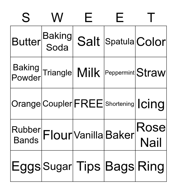 This bingo card has a free space and 24 words: Flour, Sugar, Milk, Eggs, Color, Butter, Baking Powder, Baking Soda, Shortening, Vanilla, Peppermint, Orange, Baker, Rose Nail, Triangle, Bags, Icing, Salt, Straw, Coupler, Ring, Rubber Bands, Spatula and Tips.