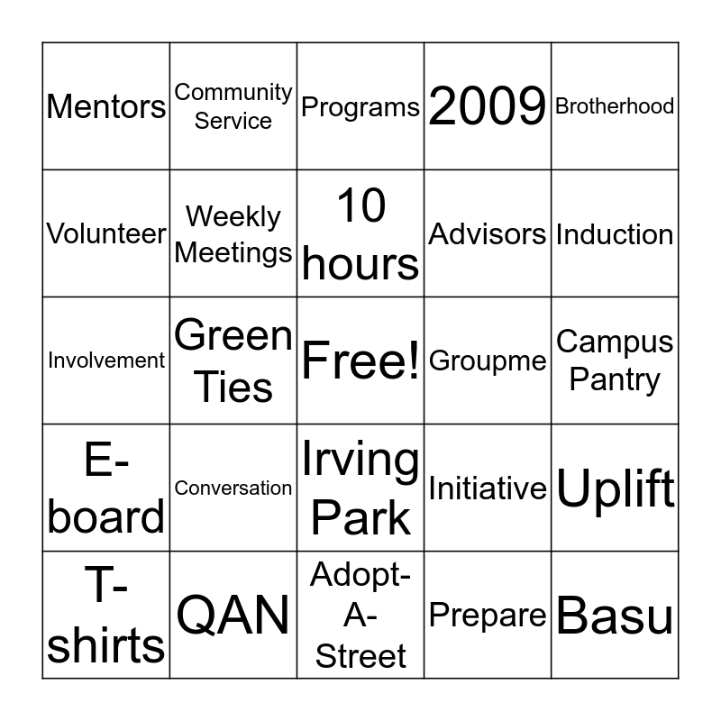 This bingo card has a free space and 33 words: Leadership, Dewarren, Green Ties, Flowers, E-board, Weekly Meetings, Brotherhood, T-shirts, Community Service, Dues, 10 hours, Programs, Instagram, Twitter, Groupme, Induction, QAN, Involvement, Conversation, Initiative, Irving Park, Field Trip, Mentors, Campus Pantry, Adopt-A-Street, Basu, 2009, Advisors, Volunteer, Uplift, Mold, Prepare and C.L.U.B..