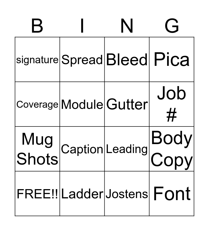 This bingo card has 16 words: Ladder, Body Copy, Bleed, signature, Mug Shots, Spread, Leading, Jostens, Coverage, Module, FREE!!, Pica, Caption, Job #, Gutter and Font.