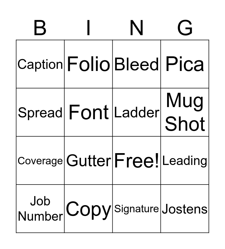 This bingo card has 16 words: Copy, Leading, Bleed, Caption, Coverage, Folio, Free!, Signature, Spread, Font, Job Number, Pica, Gutter, Mug Shot, Ladder and Jostens.