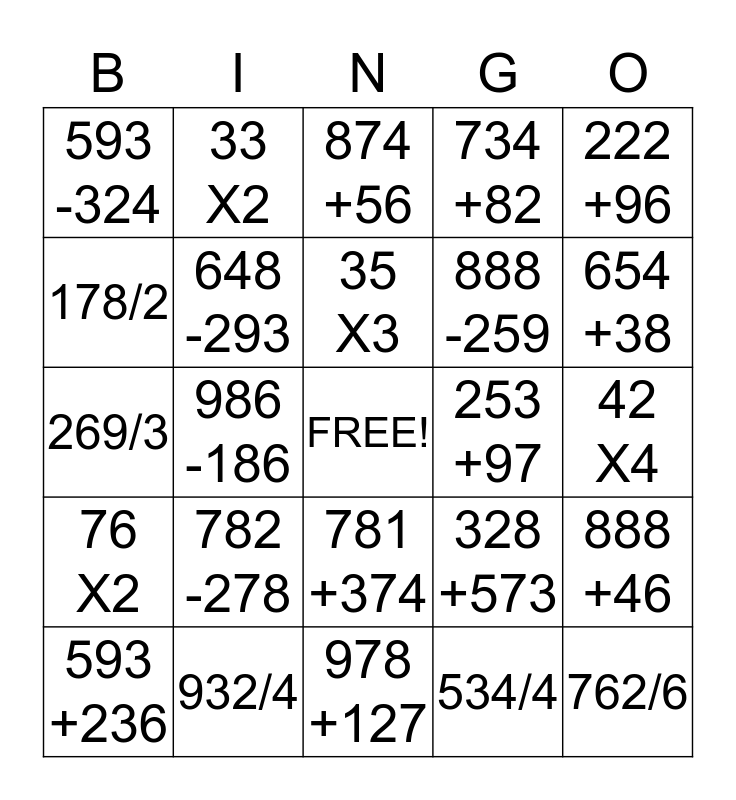 This bingo card has a free space and 24 words: 782 -278, 932/4, 35 X3, 593 +236, 222 +96, 593 -324, 178/2, 33 X2, 253 +97, 781 +374, 888 -259, 269/3, 328 +573, 888 +46, 648 -293, 534/4, 42 X4, 874 +56, 654 +38, 986 -186, 762/6, 76 X2, 734 +82 and 978 +127.