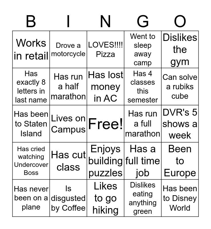 This bingo card has a free space and 24 words: Has cut class, Is disgusted by Coffee, Has lost money in AC, Has never been on a plane, Dislikes the gym, Works in retail, Has exactly 8 letters in last name, Drove a motorcycle, Has run a full marathon, Enjoys building puzzles, Has 4 classes this semester, Has been to Staten Island, Has a full time job, Been to Europe, Has run a half marathon, Dislikes eating anything green, DVR's 5 shows a week, LOVES!!!! Pizza, Can solve a rubiks cube, Lives on Campus, Has been to Disney World, Has cried watching Undercover Boss, Went to sleep away camp and Likes to go hiking.
