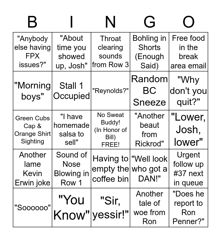 This bingo card has a free space and 24 words: Sound of Nose Blowing in Row 1, "You Know", "Reynolds?", "Soooooo", Free food in the break area email, "Anybody else having FPX issues?", "Morning boys", "About time you showed up, Josh", "Another beaut from Rickrod", Having to empty the coffee bin, Random BC Sneeze, Green Cubs Cap & Orange Shirt Sighting, "Well look who got a DAN!", Urgent follow up #37 next in queue, Stall 1 Occupied, Another tale of woe from Ron, "Lower, Josh, lower", Throat clearing sounds from Row 3, "Why don't you quit?", "I have homemade salsa to sell", "Does he report to Ron Penner?", Another lame Kevin Erwin joke, Bohling in Shorts (Enough Said) and "Sir, yessir!".