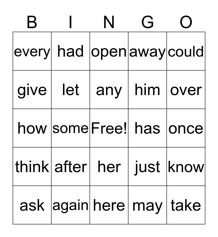 This bingo card has a free space and 24 words: after, again, any, ask, could, every, give, had, has, her, him, how, just, know, let, may, once, open, over, some, take, think, away and here.