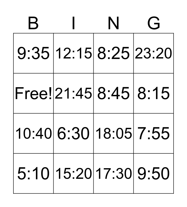 This bingo card has 16 words: 15:20, 7:55, 8:25, 9:35, 10:40, 12:15, 18:05, 17:30, Free!, 21:45, 5:10, 23:20, 6:30, 8:15, 8:45 and 9:50.