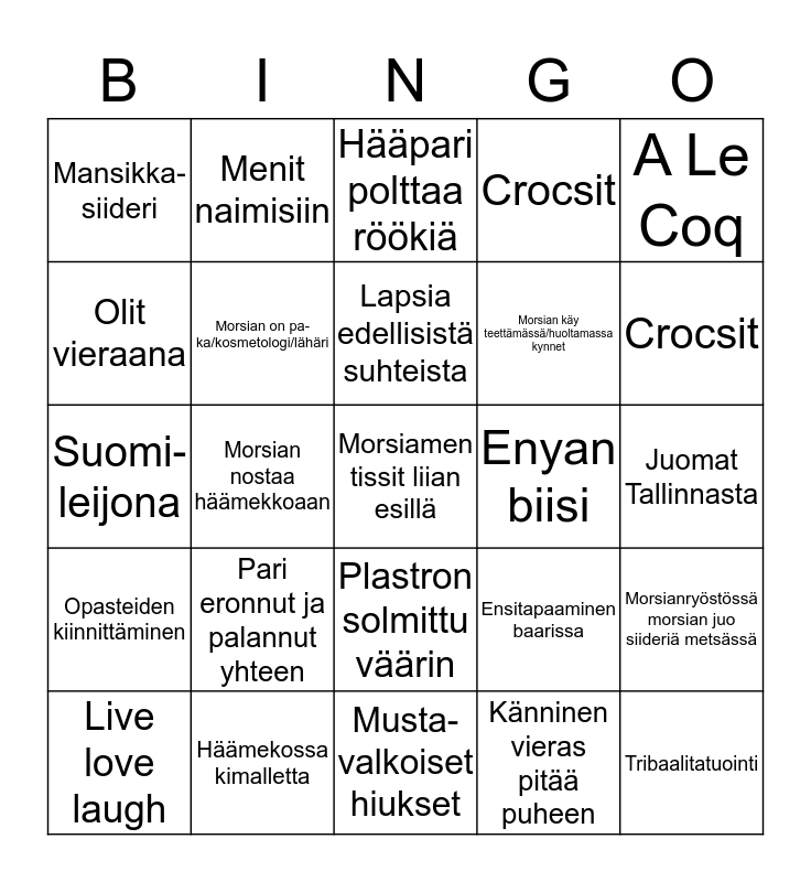 This bingo card has 25 words: Pari eronnut ja palannut yhteen, Musta-valkoiset hiukset, Lapsia edellisistä suhteista, Live love laugh, A Le Coq, Mansikka-siideri, Olit vieraana, Menit naimisiin, Enyan biisi, Plastron solmittu väärin, Morsian käy teettämässä/huoltamassa kynnet, Suomi-leijona, Ensitapaaminen baarissa, Morsianryöstössä morsian juo siideriä metsässä, Morsian on pa-ka/kosmetologi/lähäri, Tribaalitatuointi, Juomat Tallinnasta, Hääpari polttaa röökiä, Crocsit, Morsian nostaa häämekkoaan, Morsiamen tissit liian esillä, Häämekossa kimalletta, Opasteiden kiinnittäminen, Crocsit and Känninen vieras pitää puheen.