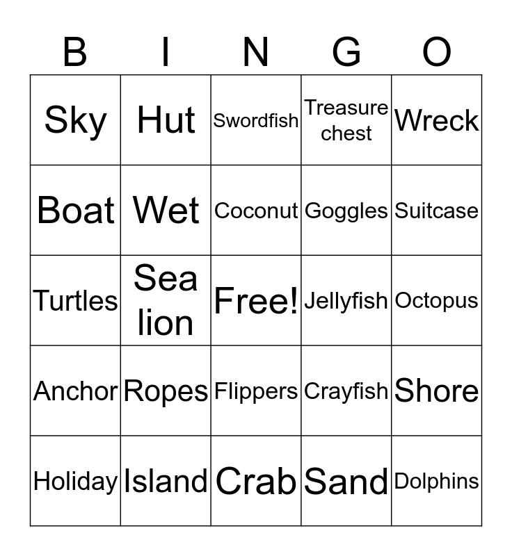 This bingo card has a free space and 27 words: Holiday, Island, Coconut, Sand, Suitcase, Sky, Hut, Flippers, Goggles, Dolphins, Turtles, Wet, Waves, Crayfish, Octopus, Seaweed, Sea lion, Swordfish, Jellyfish, Wreck, Anchor, Ropes, Crab, Treasure chest, Shore, Boat and Submarine.
