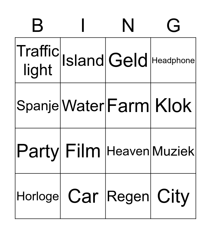 This bingo card has 16 words: Car, Muziek, Geld, Traffic light, Party, Island, Heaven, Regen, Spanje, Water, Horloge, Headphone, Film, Klok, Farm and City.