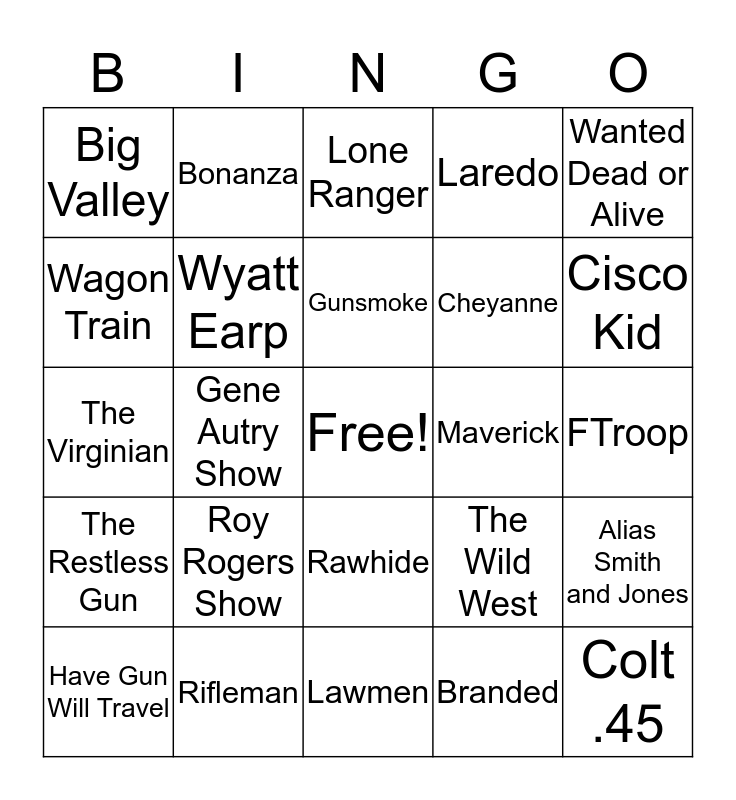 This bingo card has a free space and 24 words: Roy Rogers Show, Rifleman, Gunsmoke, Have Gun Will Travel, Wanted Dead or Alive, Big Valley, Wagon Train, Bonanza, Maverick, Rawhide, Cheyanne, The Virginian, The Wild West, Alias Smith and Jones, Wyatt Earp, Branded, FTroop, Lone Ranger, Cisco Kid, Gene Autry Show, Colt .45, The Restless Gun, Laredo and Lawmen.