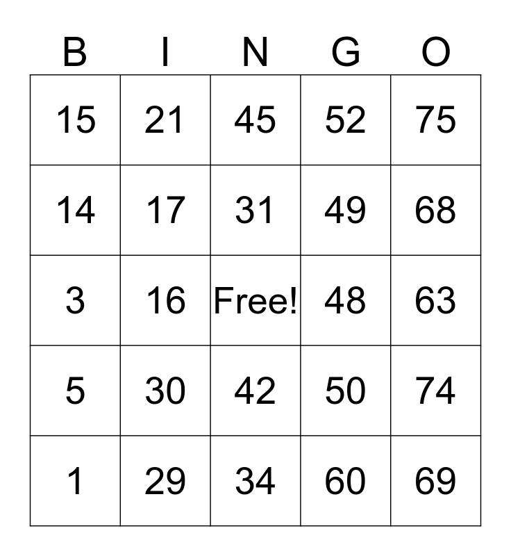 This bingo card has a free space and 24 words: 1, 30, 31, 60, 75, 15, 21, 45, 48, 63, 3, 17, 50, 74, 14, 29, 34, 52, 68, 5, 16, 42, 49 and 69.