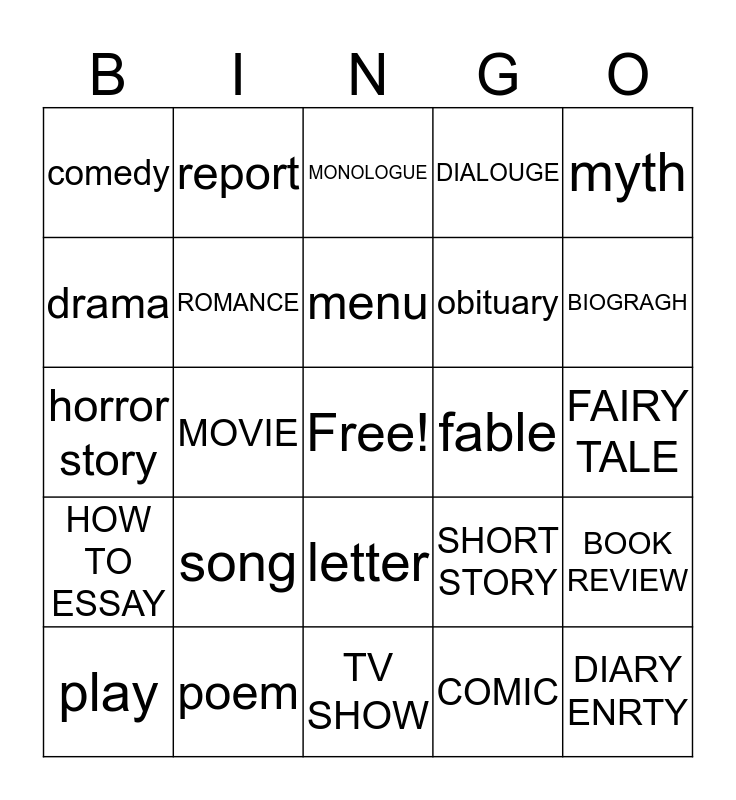 This bingo card has a free space and 24 words: song, poem, menu, play, myth, comedy, drama, report, fable, letter, obituary, horror story, SHORT STORY, BOOK REVIEW, ROMANCE, COMIC, FAIRY TALE, MONOLOGUE, BIOGRAGH, MOVIE, DIARY ENRTY, HOW TO ESSAY, DIALOUGE and TV SHOW.