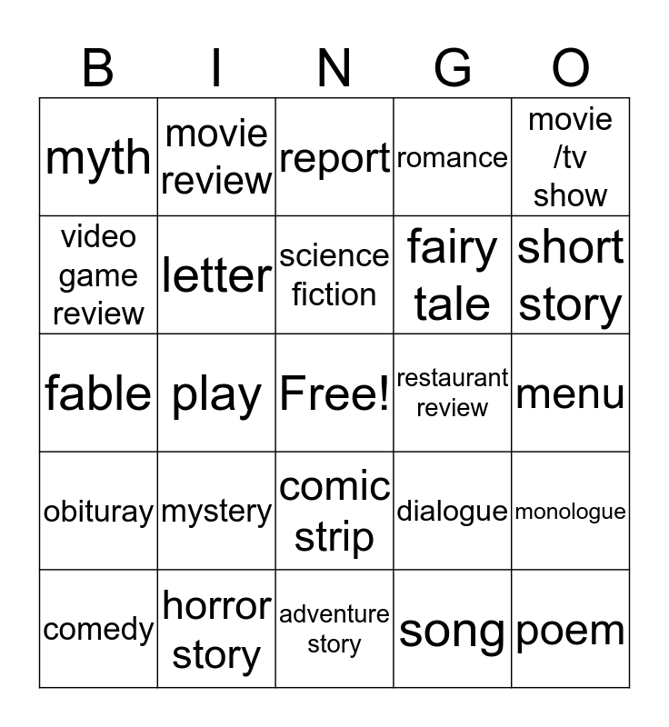 This bingo card has a free space and 24 words: mystery, horror story, science fiction, comedy, movie /tv show, myth, video game review, movie review, restaurant review, comic strip, fairy tale, fable, dialogue, monologue, letter, song, menu, report, short story, play, poem, obituray, romance and adventure story.