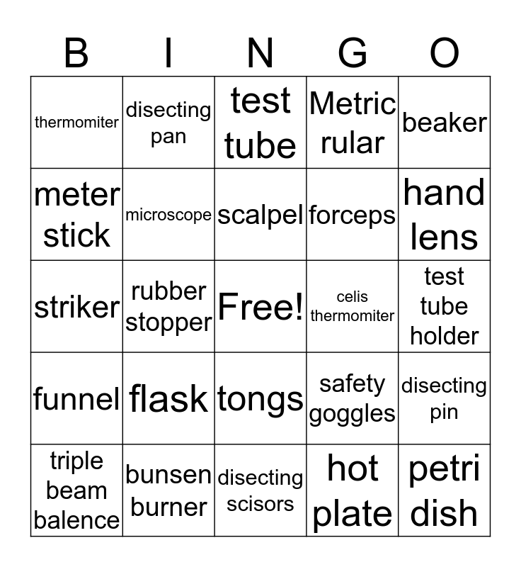This bingo card has a free space and 24 words: flask, bunsen burner, scalpel, triple beam balence, beaker, thermomiter, meter stick, disecting pan, celis thermomiter, tongs, forceps, striker, safety goggles, disecting pin, microscope, hot plate, test tube holder, test tube, hand lens, rubber stopper, petri dish, funnel, Metric rular and disecting scisors.