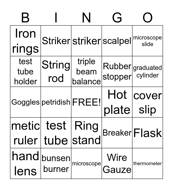 This bingo card has a free space and 24 words: test tube, bunsen burner, triple beam balance, hand lens, microscope slide, Iron rings, test tube holder, Striker, Hot plate, Ring stand, Rubber stopper, Goggles, Breaker, Flask, String rod, Wire Gauze, cover slip, striker, graduated cylinder, petridish, thermometer, metic ruler, scalpel and microscope.