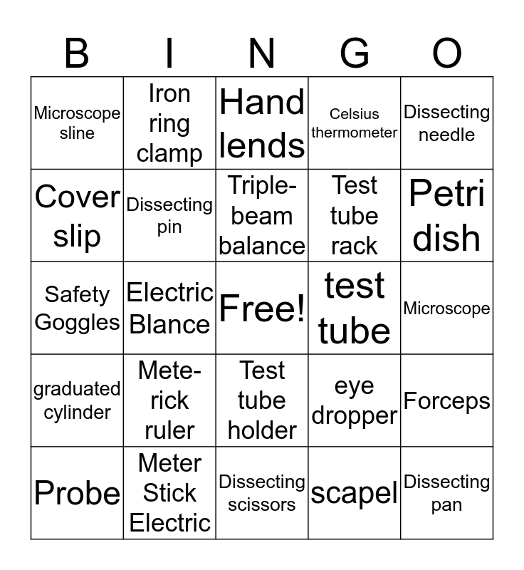 This bingo card has a free space and 24 words: Mete-rick ruler, Meter Stick Electric, Triple-beam balance, Probe, Dissecting needle, Microscope sline, Cover slip, Iron ring clamp, test tube, Test tube holder, Test tube rack, Safety Goggles, eye dropper, Forceps, Dissecting pin, scapel, Microscope, Hand lends, Petri dish, Electric Blance, Dissecting pan, graduated cylinder, Celsius thermometer and Dissecting scissors.