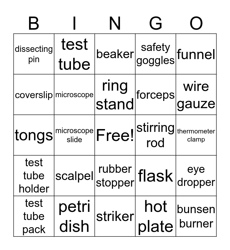 This bingo card has a free space and 24 words: scalpel, petri dish, ring stand, test tube pack, funnel, dissecting pin, coverslip, test tube, stirring rod, rubber stopper, forceps, tongs, flask, eye dropper, microscope, hot plate, thermometer clamp, beaker, wire gauze, microscope slide, bunsen burner, test tube holder, safety goggles and striker.
