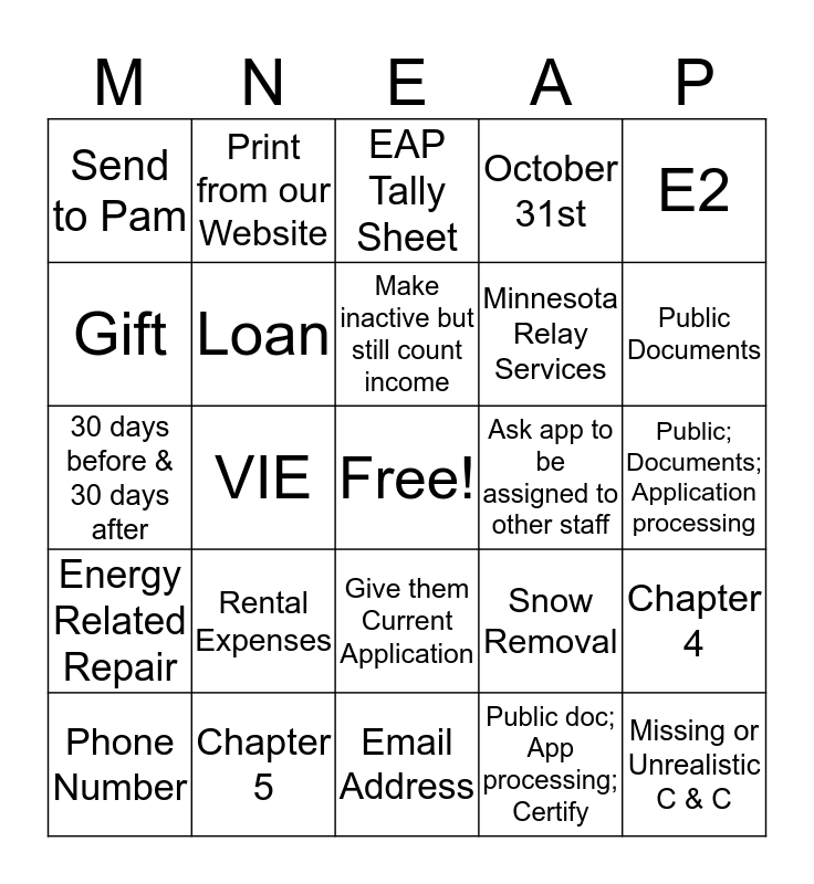 This bingo card has a free space and 24 words: Rental Expenses, Chapter 5, Make inactive but still count income, Phone Number, E2, Send to Pam, Gift, Print from our Website, Ask app to be assigned to other staff, Give them Current Application, Minnesota Relay Services, 30 days before & 30 days after, Snow Removal, Chapter 4, Loan, Public doc; App processing; Certify, Public; Documents; Application processing, EAP Tally Sheet, Public Documents, VIE, Missing or Unrealistic C & C, Energy Related Repair, October 31st and Email Address.