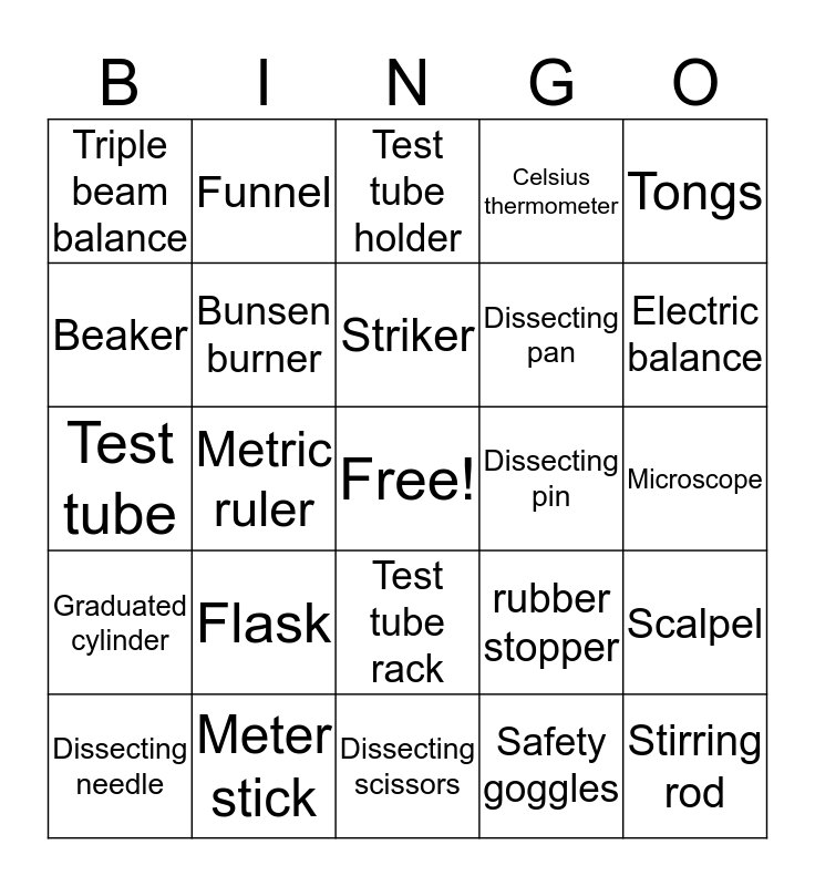 This bingo card has a free space and 24 words: Flask, Meter stick, Striker, Dissecting needle, Tongs, Triple beam balance, Beaker, Funnel, Dissecting pin, Test tube rack, Dissecting pan, Test tube, rubber stopper, Scalpel, Bunsen burner, Safety goggles, Microscope, Test tube holder, Electric balance, Metric ruler, Stirring rod, Graduated cylinder, Celsius thermometer and Dissecting scissors.