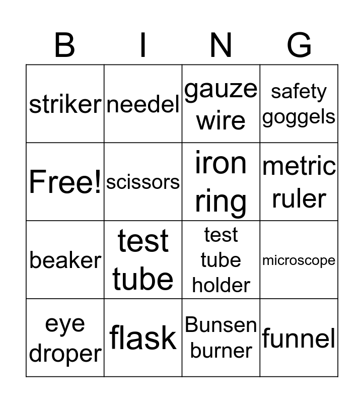 This bingo card has 16 words: flask, microscope, gauze wire, striker, beaker, needel, test tube holder, Bunsen burner, Free!, scissors, eye droper, safety goggels, test tube, metric ruler, iron ring and funnel.