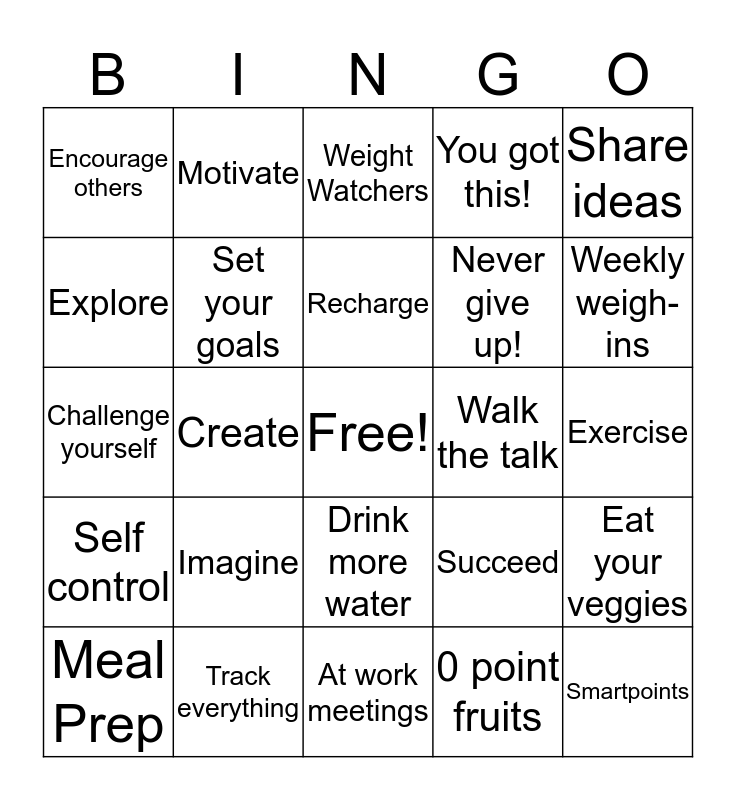 This bingo card has a free space and 24 words: Imagine, Track everything, Recharge, Meal Prep, Share ideas, Encourage others, Explore, Motivate, Walk the talk, Drink more water, Never give up!, Challenge yourself, Succeed, Eat your veggies, Set your goals, 0 point fruits, Exercise, Weight Watchers, Weekly weigh-ins, Create, Smartpoints, Self control, You got this! and At work meetings.