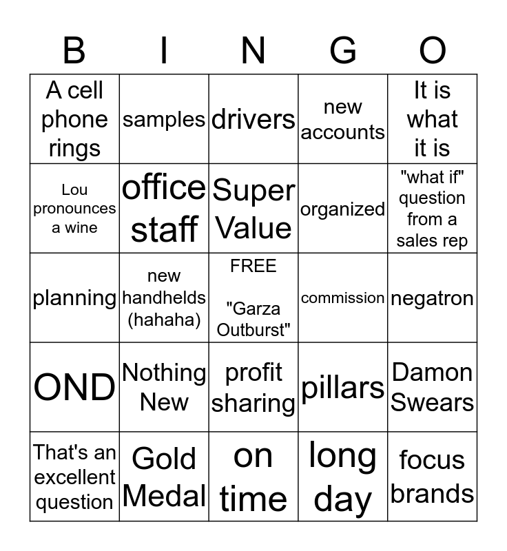 This bingo card has a free space and 24 words: Nothing New, Gold Medal, Super Value, That's an excellent question, It is what it is, A cell phone rings, Lou pronounces a wine, samples, commission, profit sharing, organized, planning, pillars, Damon Swears, office staff, long day, negatron, drivers, "what if" question from a sales rep, new handhelds (hahaha), focus brands, OND, new accounts and on time.