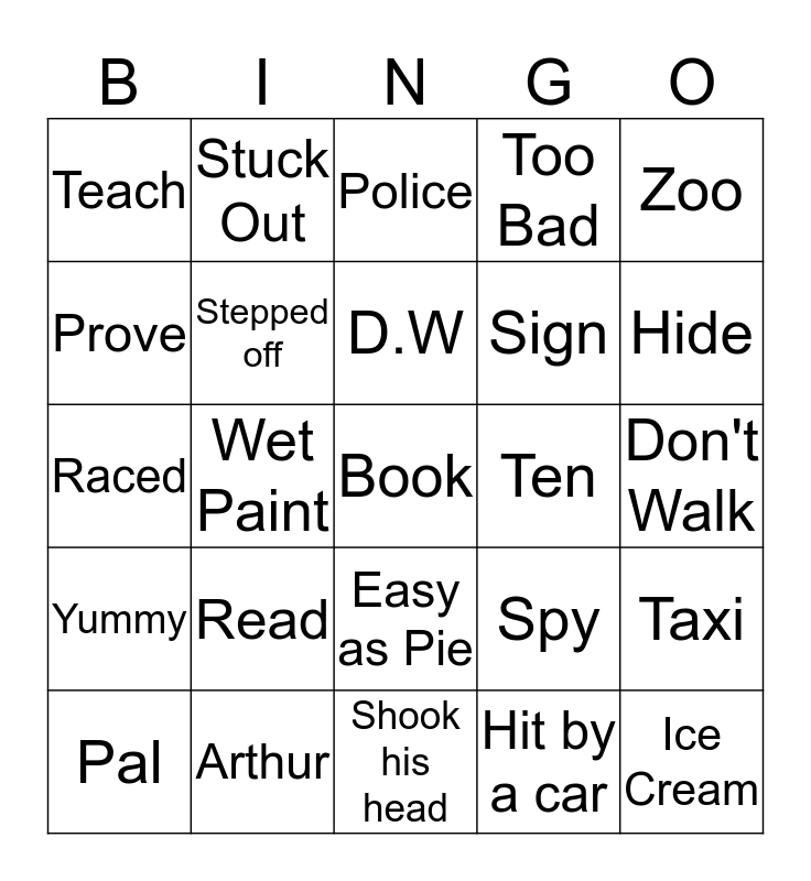 This bingo card has a free space and 24 words: Read, Arthur, D.W, Pal, Zoo, Teach, Prove, Stuck Out, Ten, Easy as Pie, Sign, Raced, Spy, Taxi, Stepped off, Hit by a car, Don't Walk, Police, Hide, Wet Paint, Ice Cream, Yummy, Too Bad and Shook his head.