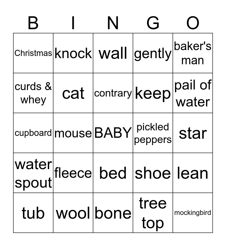 This bingo card has a free space and 24 words: fleece, wool, contrary, tub, baker's man, Christmas, curds & whey, knock, pickled peppers, bed, keep, cupboard, shoe, lean, cat, tree top, star, wall, pail of water, mouse, mockingbird, water spout, gently and bone.