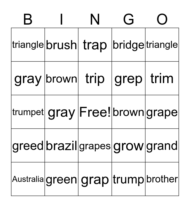 This bingo card has a free space and 24 words: brazil, green, trip, Australia, triangle, triangle, gray, brush, brown, grapes, grep, trumpet, grow, grand, brown, trump, grape, trap, trim, gray, brother, greed, bridge and grap.