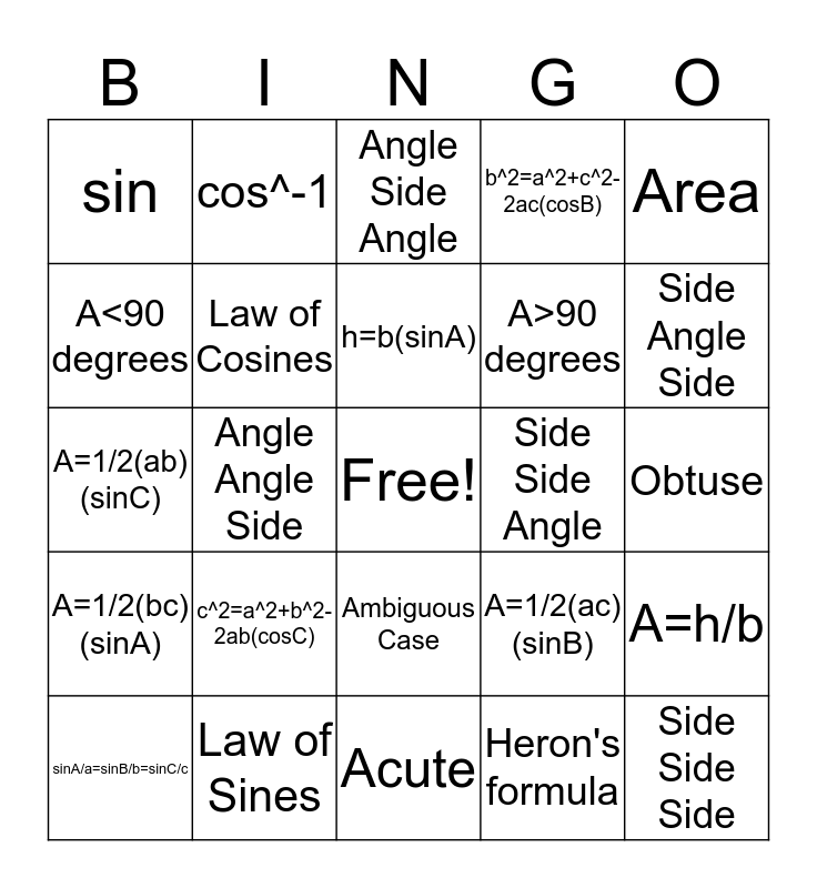 This bingo card has a free space and 30 words: Law of Sines, Triangle, Angle Angle Side, Oblique, sin, Angle Side Angle, Law of Cosines, Ambiguous Case, Side Side Angle, Acute, Obtuse, Side Side Side, Heron's formula, 1/2(a+b+c), Side Angle Side, A= √(s(s-a)(s-b)(s-c)), A=1/2(ac)(sinB), A=1/2(bc)(sinA), c^2=a^2+b^2-2ab(cosC), Area, A=1/2(ab)(sinC), a^2=c^2+b^2-2bc(cosA), cos^-1, A>90 degrees, A<90 degrees, b^2=a^2+c^2-2ac(cosB), A=h/b, sinA/a=sinB/b=sinC/c, h=b(sinA) and a/sinA=b/sinB=c/sinC.
