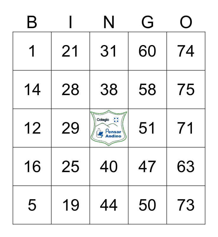 This bingo card has a free space and 24 words: 5, 25, 38, 50, 74, 1, 21, 31, 51, 71, 12, 28, 47, 63, 14, 19, 44, 60, 75, 16, 29, 40, 58 and 73.