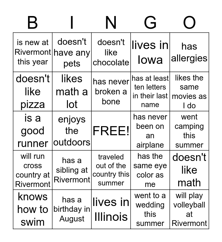 This bingo card has a free space and 24 words: has a sibling at Rivermont, has a birthday in August, has never broken a bone, knows how to swim, has allergies, is new at Rivermont this year, doesn't like pizza, doesn't have any pets, has never been on an airplane, traveled out of the country this summer, has at least ten letters in their last name, is a good runner, has the same eye color as me, doesn't like math, likes math a lot, went to a wedding this summer, went camping this summer, doesn't like chocolate, likes the same movies as I do, enjoys the outdoors, will play volleyball at Rivermont, will run cross country at Rivermont, lives in Iowa and lives in Illinois.