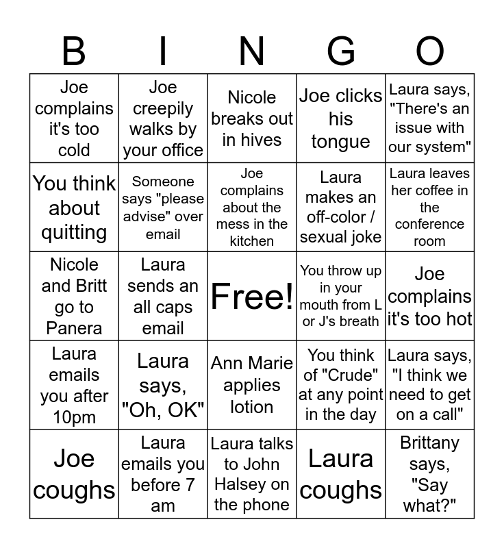This bingo card has a free space and 24 words: Laura says, "Oh, OK", Laura emails you before 7 am, Joe complains about the mess in the kitchen, Joe coughs, Laura says, "There's an issue with our system", Joe complains it's too cold, You think about quitting, Joe creepily walks by your office, You throw up in your mouth from L or J's breath, Ann Marie applies lotion, Laura makes an off-color / sexual joke, Nicole and Britt go to Panera, You think of "Crude" at any point in the day, Laura says, "I think we need to get on a call", Someone says "please advise" over email, Laura coughs, Joe complains it's too hot, Nicole breaks out in hives, Laura leaves her coffee in the conference room, Laura sends an all caps email, Brittany says, "Say what?", Laura emails you after 10pm, Joe clicks his tongue and Laura talks to John Halsey on the phone.