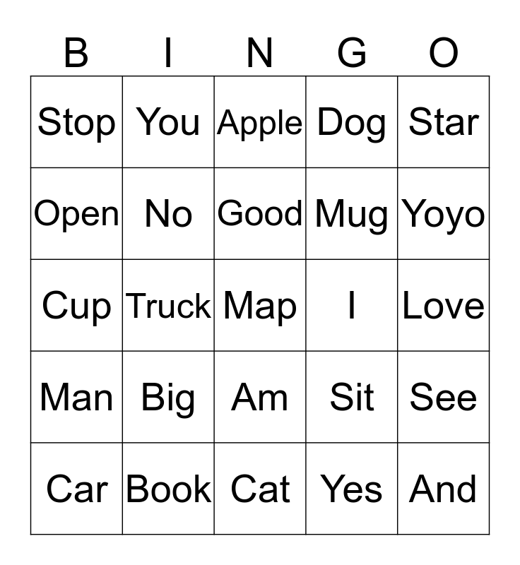 This bingo card has a free space and 24 words: Big, Book, Good, Car, Star, Stop, Open, You, I, Am, Mug, Cup, Sit, See, No, Yes, Love, Apple, Yoyo, Truck, And, Man, Dog and Cat.