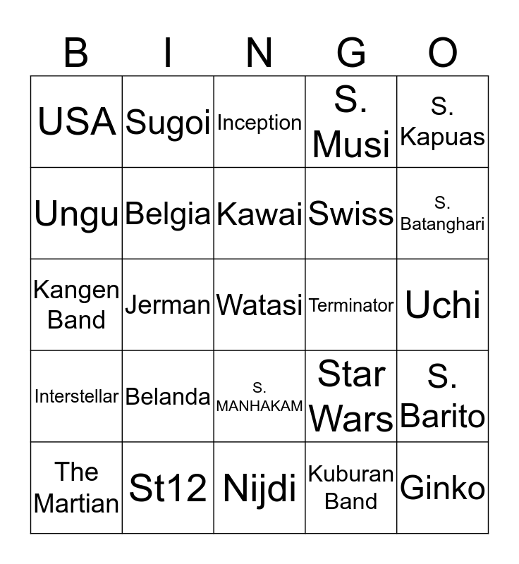 This bingo card has a free space and 24 words: Belanda, St12, Kawai, The Martian, S. Kapuas, USA, Ungu, Sugoi, Terminator, S. MANHAKAM, Swiss, Kangen Band, Star Wars, S. Barito, Belgia, Kuburan Band, Uchi, Inception, S. Batanghari, Jerman, Ginko, Interstellar, S. Musi and Nijdi.