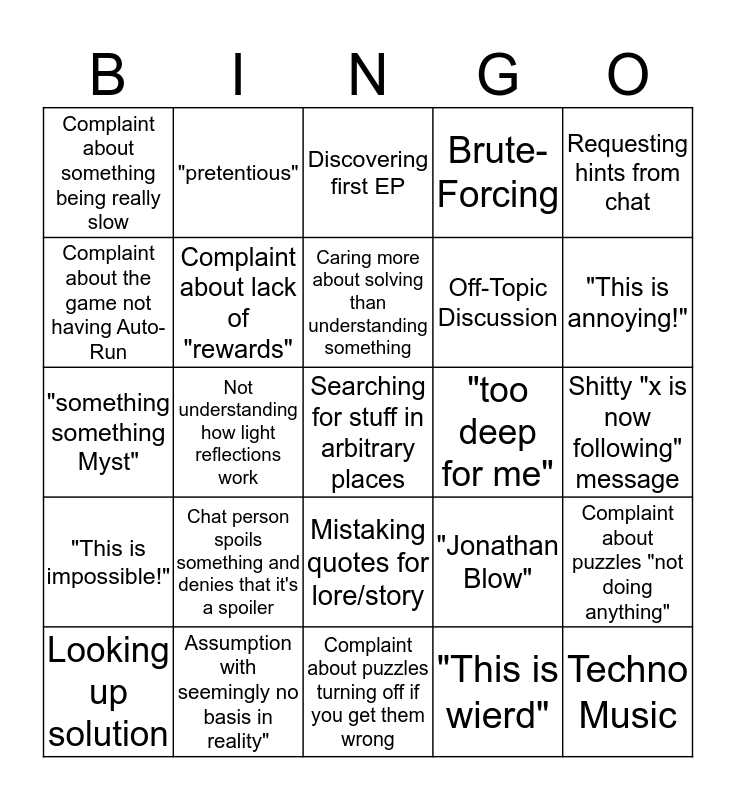 This bingo card has 25 words: Chat person spoils something and denies that it's a spoiler, Complaint about puzzles turning off if you get them wrong, Caring more about solving than understanding something, Looking up solution, Requesting hints from chat, Complaint about something being really slow, Complaint about the game not having Auto-Run, "pretentious", "too deep for me", Mistaking quotes for lore/story, Off-Topic Discussion, "something something Myst", "Jonathan Blow", Complaint about puzzles "not doing anything", Complaint about lack of "rewards", Techno Music, Shitty "x is now following" message, Discovering first EP, "This is annoying!", Not understanding how light reflections work, Searching for stuff in arbitrary places, Assumption with seemingly no basis in reality", "This is impossible!", Brute-Forcing and "This is wierd".