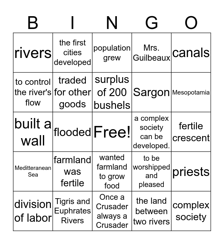 This bingo card has a free space and 24 words: farmland was fertile, Tigris and Euphrates Rivers, surplus of 200 bushels, division of labor, canals, rivers, to control the river's flow, the first cities developed, a complex society can be developed., wanted farmland to grow food, Sargon, built a wall, to be worshipped and pleased, priests, traded for other goods, the land between two rivers, fertile crescent, population grew, Mesopotamia, flooded, complex society, Meditteranean Sea, Mrs. Guilbeaux and Once a Crusader always a Crusader.