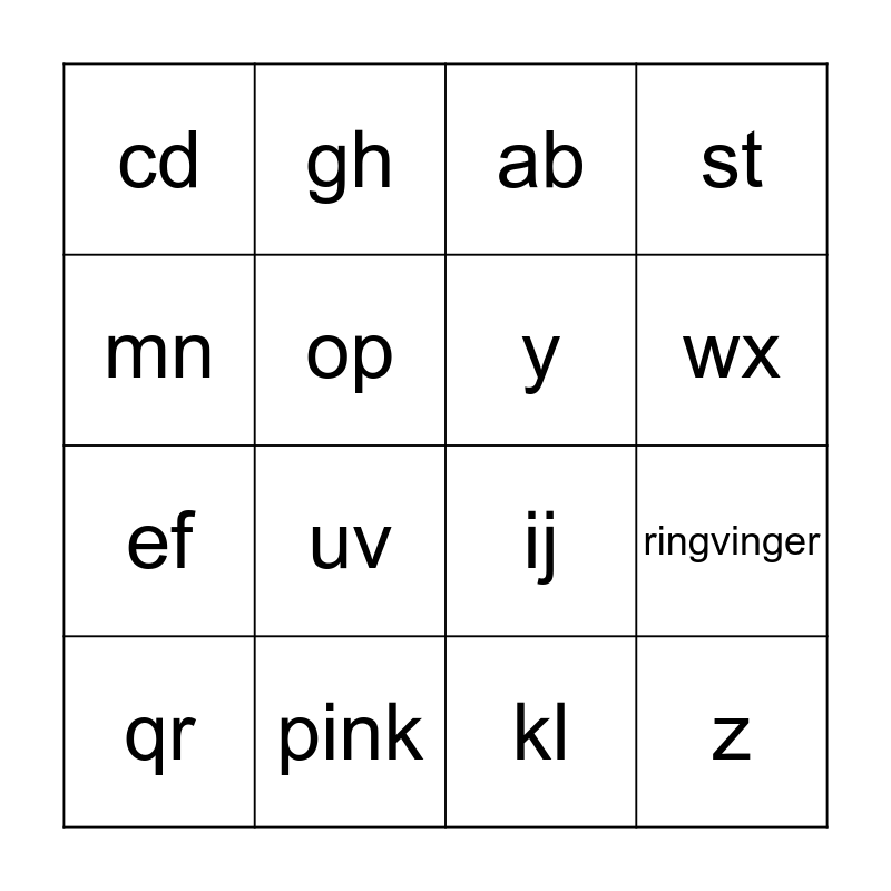 This bingo card has 16 words: pink, ringvinger, ab, cd, ef, gh, ij, kl, mn, op, qr, st, uv, wx, y and z.