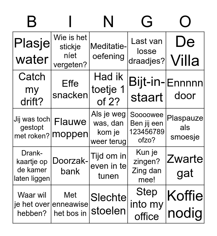 This bingo card has 25 words: Doorzak-bank, Slechte stoelen, Had ik toetje 1 of 2?, Waar wil je het over hebben?, De Villa, Plasje water, Catch my drift?, Wie is het stickje níet vergeten?, Soooowee Ben jij een 123456789 ofzo?, Tijd om in even in te tunen, Bijt-in-staart, Jij was toch gestopt met roken?, Kun je zingen? Zing dan mee!, Zwarte gat, Effe snacken, Koffie nodig, Plaspauze als smoesje, Meditatie-oefening, Ennnnn door, Flauwe moppen, Als je weg was, dan kom je weer terug, Met enneawise het bos in, Drank-kaartje op de kamer laten liggen, Last van losse draadjes? and Step into my office.