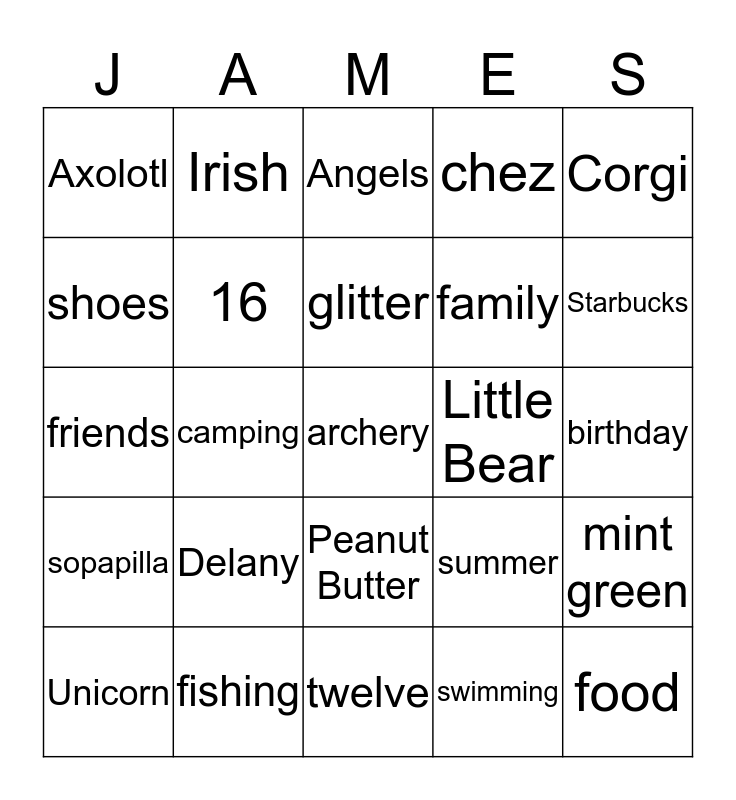 This bingo card has 25 words: Delany, twelve, glitter, Unicorn, Corgi, Axolotl, shoes, Irish, Little Bear, Peanut Butter, family, friends, summer, mint green, 16, food, birthday, Angels, Starbucks, camping, archery, fishing, sopapilla, chez and swimming.