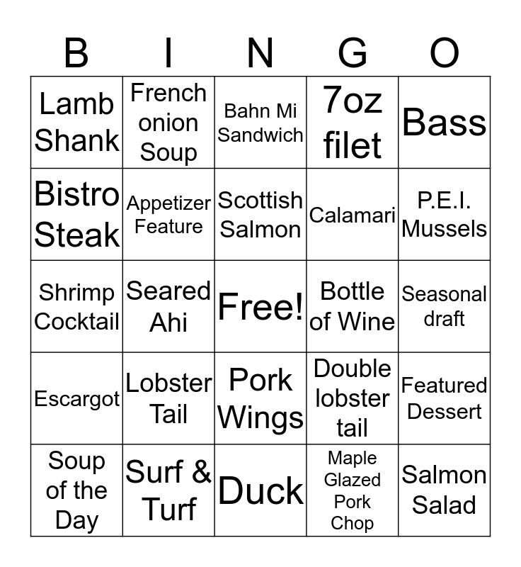 This bingo card has a free space and 24 words: Lobster Tail, Surf & Turf, Scottish Salmon, Soup of the Day, Bass, Lamb Shank, Bistro Steak, French onion Soup, Bottle of Wine, Pork Wings, Calamari, Shrimp Cocktail, Double lobster tail, Featured Dessert, Appetizer Feature, Maple Glazed Pork Chop, Seasonal draft, Bahn Mi Sandwich, P.E.I. Mussels, Seared Ahi, Salmon Salad, Escargot, 7oz filet and Duck.