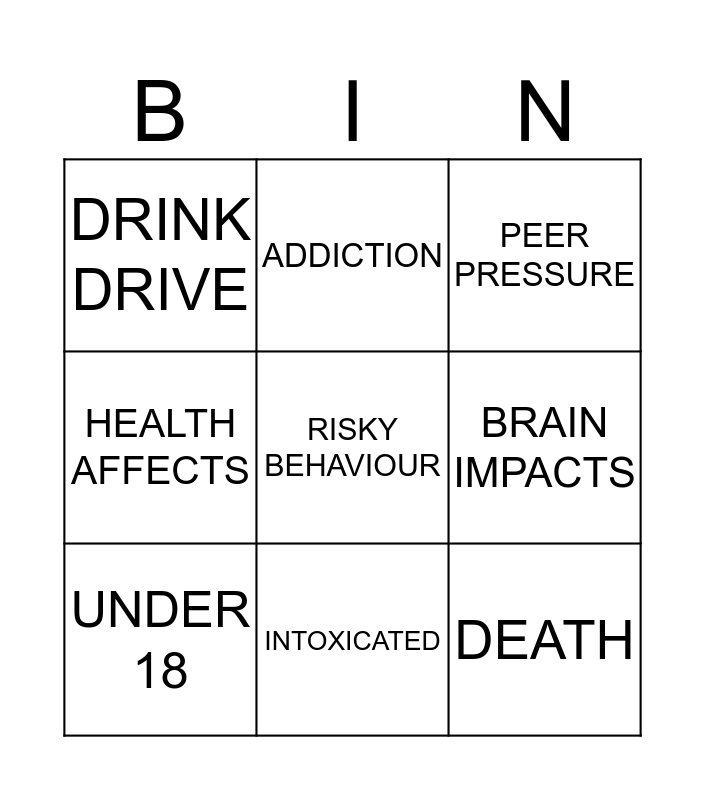 This bingo card has 9 words: UNDER 18, PEER PRESSURE, ADDICTION, HEALTH AFFECTS, DRINK DRIVE, BRAIN IMPACTS, RISKY BEHAVIOUR, DEATH and INTOXICATED.