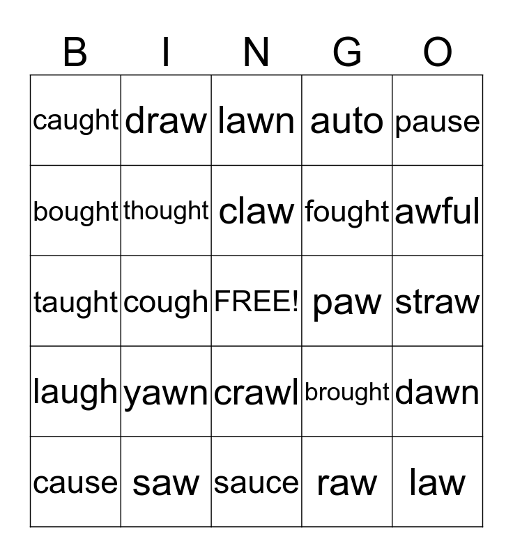 This bingo card has a free space and 24 words: yawn, saw, claw, cause, pause, caught, bought, draw, paw, crawl, fought, taught, brought, dawn, thought, raw, straw, lawn, awful, cough, law, laugh, auto and sauce.