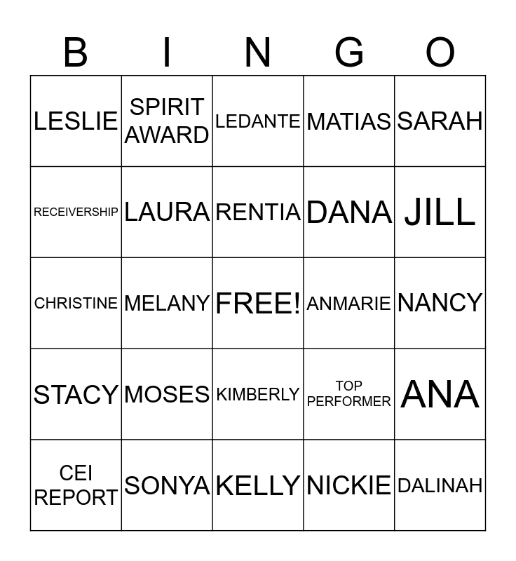 This bingo card has a free space and 41 words: TIM, CHRISTINE, EATHER, LAURA, SONYA, KIMBERLY, RENTIA, ROBERTA, SARAH, STACY, MELANY, MATIAS, DALINAH, NANCY, ANMARIE, MOSES, CHO, LESLIE, MARIE, LEDANTE, ANA, ANGELA, KELLY, DANA, ADRIEL, GLORIA, NICKIE, DENISE, JILL, ALLAN, CREDIT SERVICES, SPIRIT AWARD, CEI REPORT, FIRST CHOICE, TOP PERFORMER, RECEIVERSHIP, BANKRUPTCY, CREDIT INBOUND, SENIOR CREDIT REP, CORE REPS and DND.