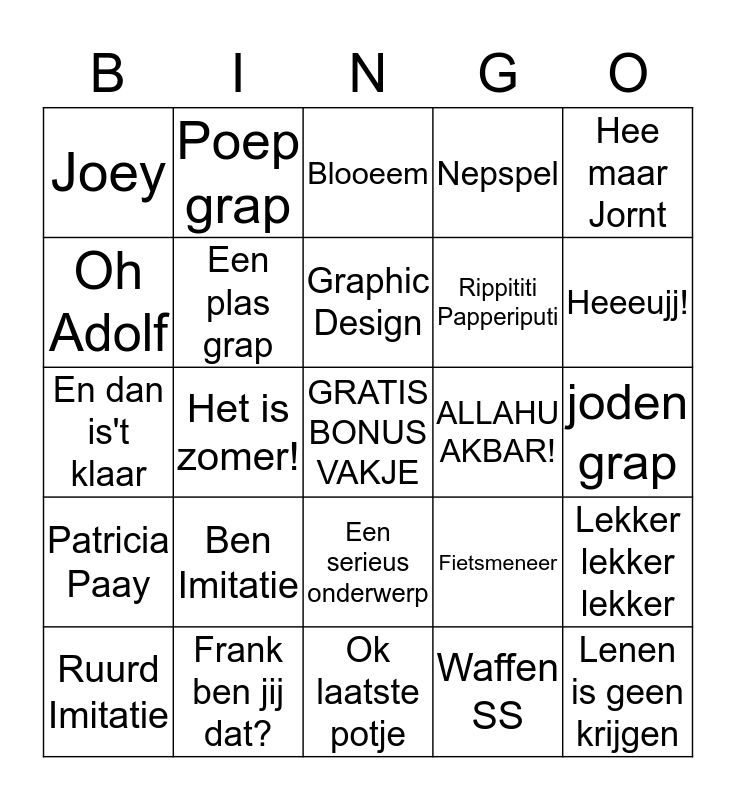 This bingo card has a free space and 24 words: Ben Imitatie, Frank ben jij dat?, Graphic Design, Ruurd Imitatie, Hee maar Jornt, Joey, Oh Adolf, Poep grap, ALLAHU AKBAR!, Een serieus onderwerp, Rippititi Papperiputi, En dan is't klaar, Fietsmeneer, Lekker lekker lekker, Een plas grap, Waffen SS, joden grap, Blooeem, Heeeujj!, Het is zomer!, Lenen is geen krijgen, Patricia Paay, Nepspel and Ok laatste potje.